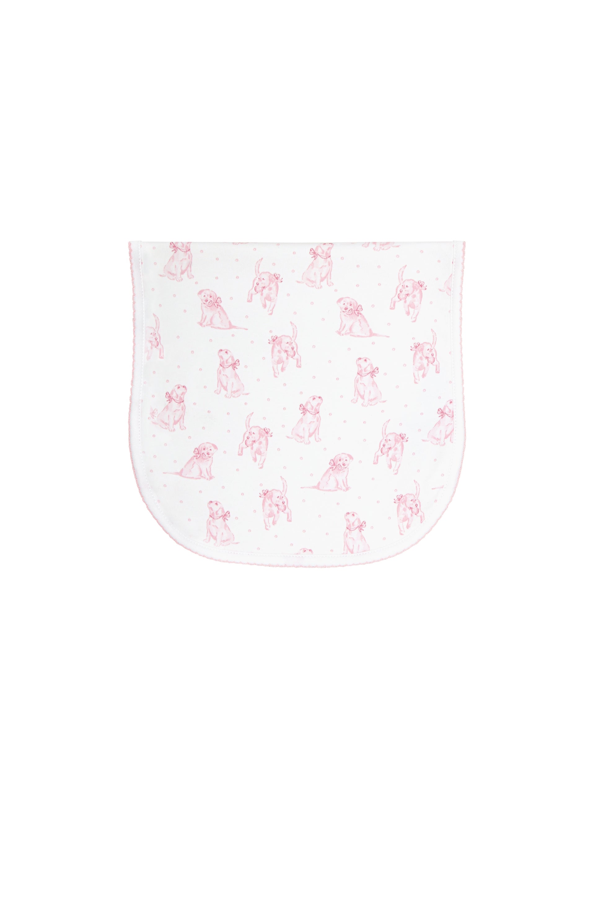 Gentle on little cheeks and tough on spills. Made from ultra-soft, absorbent Pima cotton with a charming pink puppy design, this burp cloth keeps you comfortably covered while adding a hint of elegance to mealtime routines.